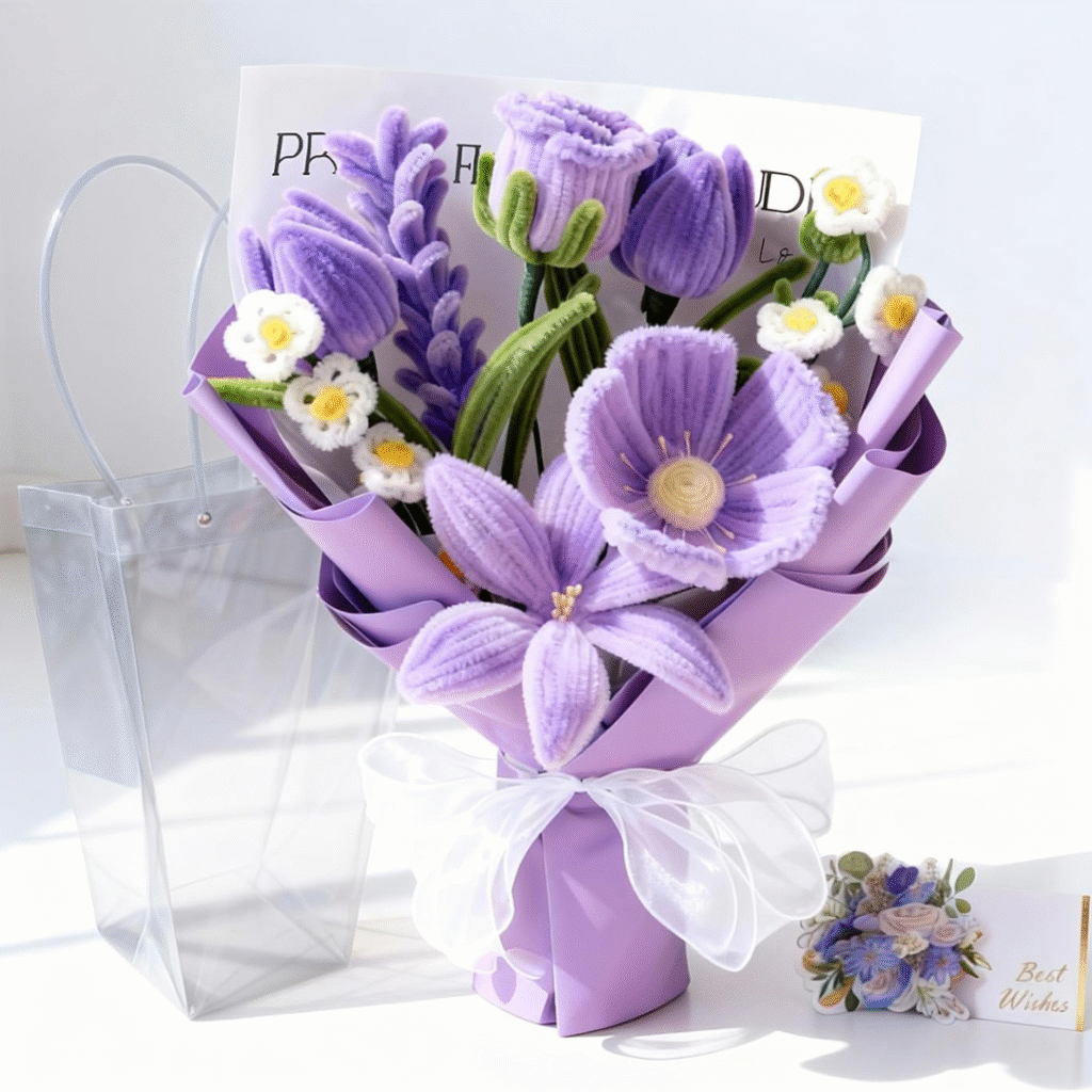 Celebrate lasting love and meaningful moments with this Handmade Pipe Cleaner & Crochet Flower Bouquet in a beautiful purple hue.